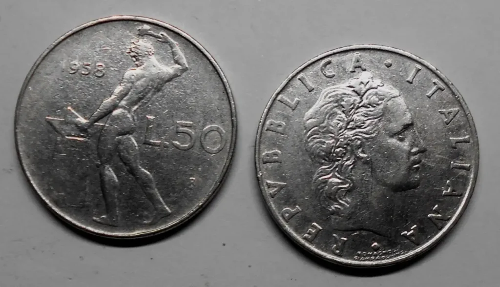 Le monete da 50 lire, con l’immagine del dio mitologico del fuoco Vulcano, rappresentano un capitolo affascinante della numismatica italiana. Il dritto è stato disegnato da Guido Romagnoli (con il busto dell’Italia Turrita) e il rovescio da Riccardo Dalla, e la produzione di queste monete emesse è stata limitata, rendendole preziose.